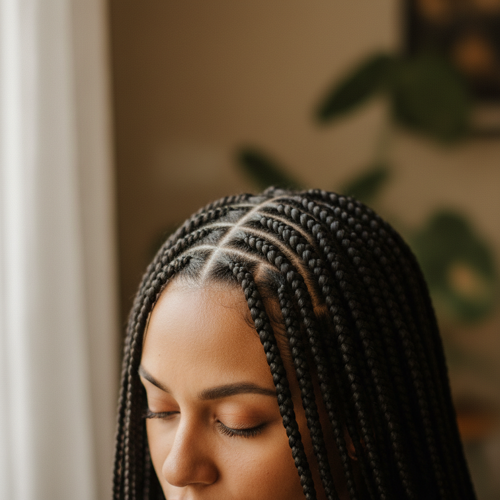 Box braids zonder knoop aan de wortel — minder spanning, meer comfort.